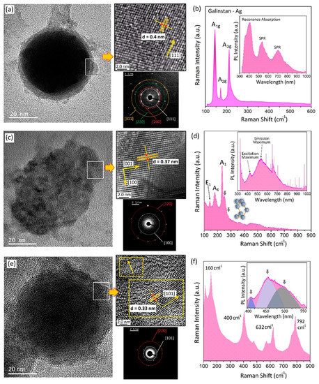 The following characterization tests showed that Nb nanodomains were developed on the surface of galinstan NPs by the sonochemistry method. The TEM studies confirmed the polycrystalline nature of Nb nanodomains (Figure 3e). The Nb nanodomains with small dimensions (~5 nm) grew extensively on the galinstan NPs. The typical TEM image and corresponding SAED patterns depict the growth of (101) and (220) planes attributed to the crystalline plane of Nb (ICSD 55957) (Figure 3e) [56]. The Raman spectroscopy consequently showed characteristic peaks of Nb-O bonding at 160 cm−1, 400 cm−1, 632 cm−1, and 792 cm−1 (Figure 3f) [57]. The PL intensity of galinstan-Nb structures demonstrated three individual broad peaks in the vicinity of 410 nm (3.02 eV), 460 nm (2.69 eV), and 500 nm (2.47 eV) wavelengths (Figure 3f). These peaks are assigned to the PL peaks of the Nb-O bonds [58]. Niobium and niobium-based compounds are of high interest for superconducting applications. However, niobium also shows an insulating niobium oxide layer with distinguished dielectric properties. The detection of Nb-O bonds can be attributed to the immediate oxidation of Nb nanostructures in ambient atmosphere [58]. Since the characterization tests were conducted under ambient condition, the immediate passivation of Nb nanoparticles is expected during the investigations. Generally, the TEM observations accompanied by Raman and PL spectroscopy techniques confirmed the polycrystalline nature of developed nanodomains on the galinstan NPs. Interestingly, the photonic properties of functionalized NPs were extensively different from each other. The plasmonic Ag and Se nanodomains were coupled with the 2D surface oxide semiconductor film of galinstan NPs (Ga2O3), resulting in the detection of resonance absorption, SPR, and excitation maximum phenomena during the PL spectroscopy measurements. Therefore, the 2D heterointerfaces of galinstan NPs possess visible-light plasmonic characteristics, providing a unique opportunity for photonic applications.
