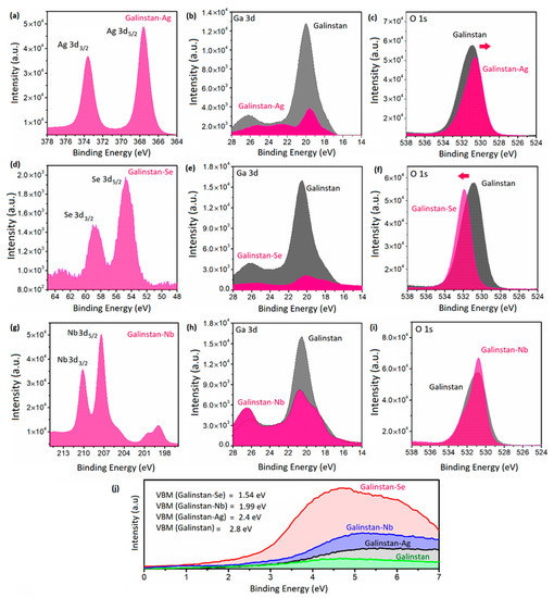 The investigations on the XPS spectra of synthesized nanostructures provide extensive information on the composition, oxidation states, and valence band maximum (VBM) at 2D heterointerfaces of nanostructures. Figure 4 shows the results of XPS and monochromatic XPS measurements of the galinstan NPs with Ag, Se, and Nb nanodomains. Figure 4a shows two individual and sharp peaks of Ag 3d3/2 and Ag 3d5/2 at 373 eV and 367 eV, confirming the growth of Ag nanodomains at heterointerfaces. The following investigation on Ga 3d XPS peaks shows that the intensity of these peaks considerably decreased (Figure 4b) and slightly shifted to lower binding energies after functionalization of galinstan with Ag nanodomains. It confirms the alteration of binding energies at galinstan-Ag heterointerfaces. The O 1s peak also shifted to lower binding energies after the growth of Ag nanodomains on galinstan NPs (Figure 4c). It further confirms the alteration of oxidation states at heterointerfaces. The lower binding energies of O 1s peak is attributed to their lower oxidation states or chemical shift due to developed chemical bonds. The following experiments on the galinstan-Se nanostructures showed two Se 3d3/2 and 3d5/2 peaks at 58.8 eV and 54.7 eV, respectively (Figure 4d). The peak at 58.8 eV shows the presence of Se4+ species, such as selenate compounds, in nanostructures [58]. The functionalization of galinstan with Se nanodomains also affected the Ga 3d peak. The Ga 3d peak shifted to lower binding energy, confirming the alteration of binding energies of Ga atoms at the heterointerfaces after functionalization with Se nanodomains (Figure 4e). Considering higher electronegativity of Se (2.15 eV) than that of Ga (1.81 eV), the electron density around Se atoms is expected to be higher than that around Ga atoms. Therefore, the binding energies decreased and shifted negatively. More importantly, the intensity of Ga 3d peak decreased considerably after functionalization with Se nanodomains. The O 1s spectra of galinstan-Se heterointerfaces also shifted to higher binding energies, compared with those of galinstan NPs. The higher binding energies of O 1s spectra is an indication of developed chemical interactions between Ga and Se atoms. It represents the changes in the oxidation states of Ga atoms. Moreover, the study on the galinstan-Nb heterointerfaces showed two sharp and individual Nb 3d peaks at 207.4 eV and 210. 3 eV (Figure 4g). It further conforms the growth of Nb on the surface of galinstan NPs. After functionalization by Nb nanodomains, the intensity of Ga 3d peak decreased considerably and shifted to higher binding energies (Figure 4h). The O 1s peak of the galinstan-Nb interface did not considerably shift. Furthermore, the intensity of the O 1s peak increased slightly, confirming the higher level of oxidation at galinstan-Nb interfaces. The XPS studies provided the evidence of development of various types of heterointerfaces between galinstan NPs and metallic (Ag, Se, and Nb) nanodomains. The alteration of O 1s XPS spectra in galinstan-Ag and galinstan-Se nanodomains confirms the development of structural bonding between galinstan atoms and Ag and Se nanodomains. Therefore, it is expected that some level of electron exchange and alloying occurred at the heterointerfaces.