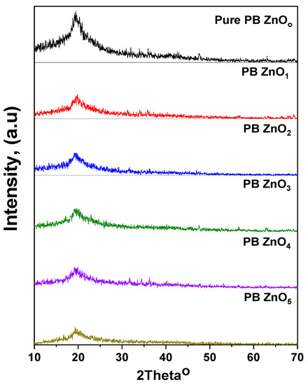 With regard to ZnO, the PB ZnO5 peak had the lowest intensity with the most broadening. Table 1 provides a detailed analysis of the peak position (2θ) and full width at half maximum (β) for the blend polymers, determined through Gaussian fitting of all XRD parameters [44,45]. The peak inside the table represents the semicrystalline peak of the blend polymer, not ZnO. At the maximum doping level of ZnO (5.5 wt%), no peaks within the XRD patterns represented the ZnO phase. Any small peaks in the XRD patterns were due to the background, not the ZnO phase. Finally, the crystalline size of the nanocomposite films was calculated using the Debye-Scherrer formula [46]: