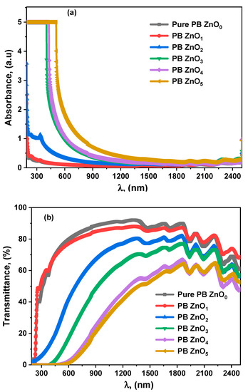 Figure 3b displays the transmission spectra of the PB ZnO nanocomposite films that were prepared. The transparent films were observed to have high transmission values in the visible region and low transmission values in the UV region for the pure PB ZnO0 sample. The transmittance curves of the synthesized PB ZnO nanocomposites showed multi-optical oscillations in the infrared region. The addition of ZnO to the blend polymer caused a significant reduction in the transmission values compared to the pure sample, resulting in a shoulder ring-like decrease in transmission values. This decrease in transmission values was due to the influence of ZnO on the host PVA/PVP matrix, which led to surface smoothness of the films, resulting in high reflectivity and increased absorbance values [65]. Another probable reason was the scattering of the ZnO nanoparticles, which reduced the intensity of the spectral range. The PB ZnO3, PB ZnO4, and PB ZnO5 samples showed a CUT-OFF or blocking of the transmission light in the wavelength range of 190 to 371 nm, indicating an extensive electronic transition in the bandgap, which was correlated with the high absorption region.