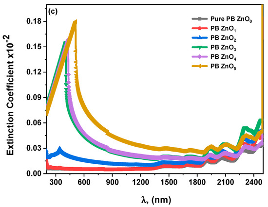 The energy bandgap of the absorption edge for the as-prepared nanocomposites can be optically determined by extrapolating α, where t represents the film thickness, as shown in Table 2. Figure 4 indicates that the steepness of the α curve increases with the ZnO wt% in the nanocomposites, increasing doping content and absorption coefficient. The absorption edge also gradually increases from Pure PB ZnO0 to PB ZnO5, with extracted values of 5.95 eV and 2.01 eV, respectively. These observations demonstrate the significant impact of doping on the structure of the PVA/PVP matrix and confirm the presence of optical energy bandgaps, which contribute to the remarkable growth of semiconductors in thin films [67,68]. The extinction coefficient (k) is a crucial optical parameter that characterizes light wave absorption in a medium, and it can be calculated using the following equation [69]: