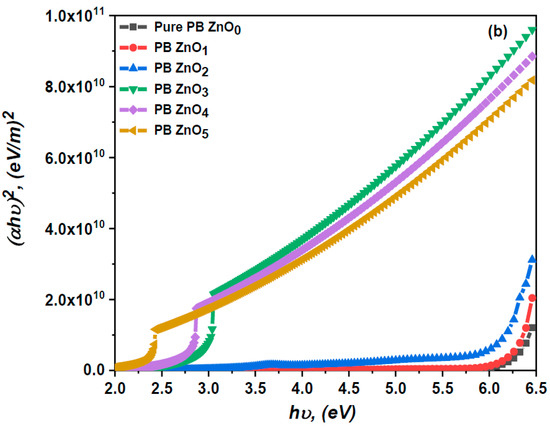Figure 4c displays the extinction coefficient of the ZnO NPs-doped PVA/PVP polymeric blend films. The optical results indicated a little shift from the UV region for the k values. There was a radical increase in the k values as the high content of ZnO NPs developed in the host PVA/PVP. Moreover, the absorption peak of ZnO was addressed, but it decreased in the high wavelength region. The light scattering process was encountered by this increase in k values from filled ZnO in the PVA/PVP polymer matrix. Tauc’s power law calculates the optical absorption spectra with a relative bandgap consistent with the literature, as described in the given relation [70]: