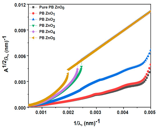 whereas , where the complete calculation of the bandgap must pass through the equation of , since . The variation of A1/2/λ against 1/λ is listed and configured in Figure 6 and Table 2, the closely relevant between the ASF and Tauc’s methods. For instance, the more filled content of ZnO doped in PVA/PVP, the lowest energy bandgap was obtained. The excellent match proves the applicability of these methods to nanocomposite films.
