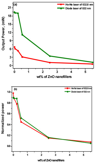 The study gains strength from including the optical limiting effect in exploring the non-linear optical properties of ZnO-doped PVA/PVP nanocomposites. The limiting effect refers to the threshold at which incoming light is restricted from accessing the films. This investigation employs two laser sources with wavelengths of 632.8 and 532 nm. In Figure 8a,b, the relationship between output power and normalized power is plotted for the two lasers as a function of the ZnO-filled PVA/PVP film’s weight percentage. Interestingly, an increase in the weight percentage of ZnO leads to a decrease in output power and its corresponding normalized power (i.e., output power divided by input power), potentially caused by an uncontrolled factor defocusing the laser beam. However, adding more ZnO NPs in the host matrix shows a significant exponential reduction in the optical limiting effect. These findings suggest that the proposed ZnO-doped PVA/PVP polymeric films exhibit the potential for higher laser attenuation, thus providing solid evidence for the films’ suitability in laser applications.