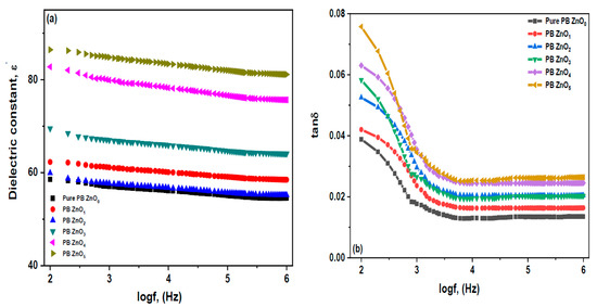 Figure 9b illustrates the variation of the dielectric loss tangent for ZnO loaded in the blend polymer. The dropping of tanδ at the lower frequency values can be attributed to the influence of the polarization effect, which describes the decrease phenomenon. This is due to the exchange of charge transfer energy between the ZnO and the PVA/PVP blend polymer. Furthermore, the marked point with the polarization becomes more robust as the charge carrier transfers a motion, thus building a loss at a higher frequency region [89]. The reinforcement of the host matrix with numerous wt% of ZnO nanofiller causes an increase in the values of tangent loss.