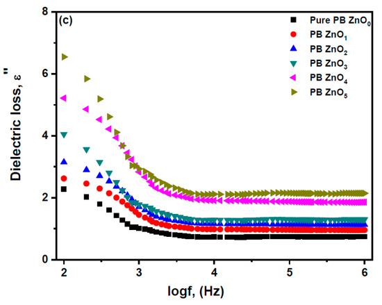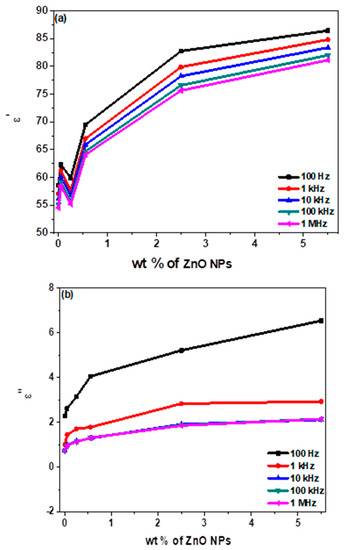 In another study, the ε′ and ε″ were investigated concerning the different wt% of ZnO at 30 °C of fixed frequency from 100 Hz to 1 MHz, as depicted in Figure 10a,b. The results indicate a change in frequency units facing a decrease in dielectric permittivity values. The utmost values of ε′ and ε″ exist at a lower frequency, and ZnO with high wt% caused a linear increase in dielectric parameters. These findings result from increased charge carrier density and space charge in the blend host matrix [62]. Additionally, it is essential to note that the growth of electrode polarization leads to the disposal of any effect of high-frequency dielectric properties [90].