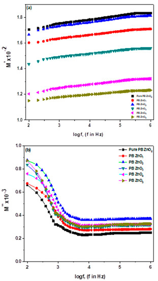 Figure 11a,b pictures the real ()and imaginary () modulus with applied frequency at room temperature. From Figure 11a, at the lower frequency region, the value seems to go toward zero as the ZnO increases inside the blend polymers. These results suggest that the materials are ruled out from any electrode polarization effect [91]. The drop of values and the increase of ZnO wt% affirmed the rise in electrode polarization and decrease in the resistance of the samples [92]. Although, the missing relaxation peaks on the compatible with ε′ in complex permittivity. These findings support the material ability in to store energy. However, regarding the imaginary part of the electric modulus, the frequency increase, followed by a decrease in values. The reason for this is associated with the restricted distance of charge carriers. A constant attitude of is noticeable at a higher frequency region. The relaxation peak reported in the electric modulus. After the ZnO is filled with blend polymer, as the higher content of ZnO, a displacement of relaxation peaks is recorded, these may cause an increase in relaxation time and a reduction in ionic conductivity [93].