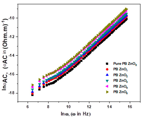 Here, the total AC electrical conductivity, named , Z describes the impedance, and A is the constant parameter that relies on the temperature. Moreover, and known as the terms of the AC and DC electrical conductivities, where is the dependent frequency and s is the exponent frequency. The graph in Figure 12 displays the relationship between the AC electrical conductivity and frequency for a PVA/PVP polymer blend containing various percentages of ZnO. As the amount of ZnO doping increases, so does the AC conductivity, indicating a correlation between enhanced charge carrier mobility [95] and AC conductivity. The frequency-dependent AC conductivity values increase with varying ZnO doping levels in the polymer blend, leading to a rise in free ions. The AC plots were extrapolated to estimate DC electrical conductivity, and the computed values are presented in Table 5. Despite ZnO being well dispersed in the blend polymer, the conductivity values were lower, except for the PB ZnO5 sample. This suggests electrode polarization could cause decreased DC values as increasing ZnO loading leads to longer polymer chains, thereby reducing DC conductivity [92]. The exponent s is a critical parameter used to describe the interactions between material impurities and charge carriers, and its value depends on temperature and frequency. The standard Debye medium is one, and the s value ranges from zero to one. Table 5 summarizes the s values of the ZnO nanocomposite films, which shifted remarkably from 1.00618 to 0.9977. The observed drop in s values with high ZnO dispersion is linked to the power law of Jonscher’s [81] and is a significant predictor of increased charge carriers.