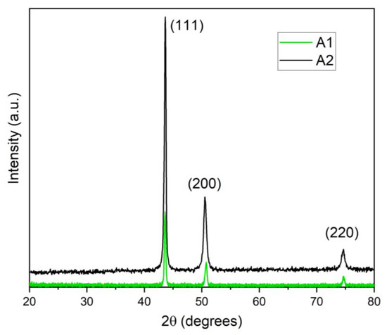 XRD patterns of A1 and A2 alloys showing FCC reflections.