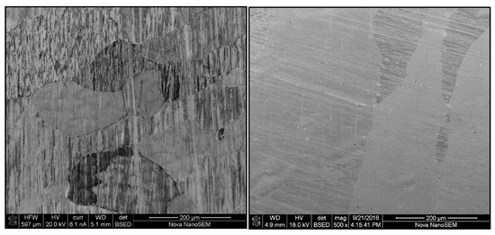 Figure 2 and Table 1 show representative SEM images and corresponding EDS chemical analysis, respectively, of the A1 and A2 alloys. The alloys exhibit microcrystalline structures with elongated grains (sizes in the range of 300–600 µm) and have no compositional segregation. Wang et al. [8] also reported that as-cast Al0.3CoCrFeNi HEA has an FCC single phase with a columnar microstructure. Similarly, Kao et al. [17] determined that Al0.37CoCrFeNi has an FCC single-phase crystal structure, also shown by Guo et al. [18] for AlxCrCuFeNi2 HEAs. The latter authors also determined that Al0.5CrCuFeNi2 alloy exhibits a dendritic microstructure. The SEM images in Figure 2 show evidence of possible interdendritic and dendritic regions retaining an FCC phase with high closeness in the lattice constants, also reported in [19,20]. Ng et al. [21] showed that a Al0.5CrCuFeNi2 alloy exhibits an FCC single phase, but due to XRD peak overlaps, they surmised there were two disordered FCC phases with very close lattice parameters at ~3.59 Å, which is equivalent to the above calculated lattice parameters for A1 and A2 alloys. Gwalani et al. [22] determined with transmission electron microscopy and selected area diffraction patterns that Al0.3CuFeCrNi2 (with the same composition as A2 alloy) has an FCC-type solid solution at ambient temperature. They further stated the high mixing entropy and sluggish effects that decrease the Gibbs energy develop a solid solution rather than intermetallic compounds, and as a result were surmised to be the reasons for the formation of a single solid solution instead of intermetallic compounds [22]. From a thermodynamic point of view, the mixing enthalpy overcomes and leads to decomposition in the matrix to form two phases.