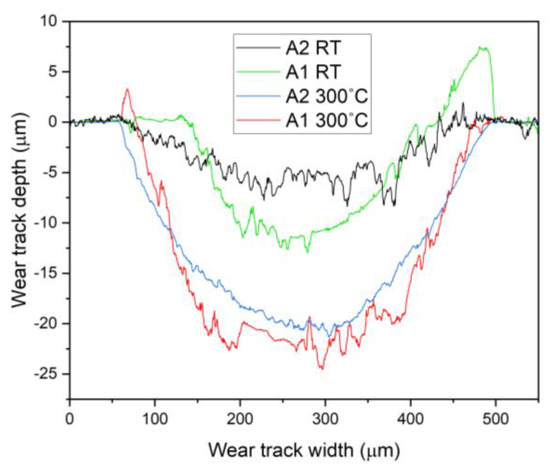 Representative cross-sectional wear track depths and widths of A1 and A2 alloys after RT and 300 °C sliding.