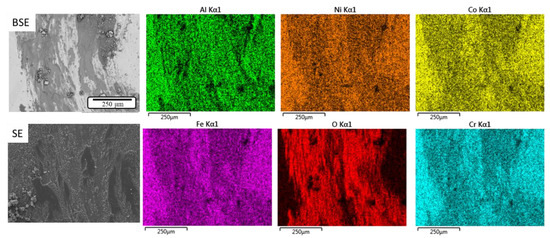Figure 4 shows representative SEM images and EDS maps of the A1 alloy wear track after RT sliding. The wear track shows signs of abrasive wear, i.e., microabrasion with grooves along the sliding direction. There is also oxidative wear based on the dark features in the BSE images (meaning a higher atomic number contrast) that coincides with the oxygen EDS map in Figure 4. Based on the elemental maps, there is not one particular metal that shows a preference for oxidative wear. This suggests that there is a mixed metal oxide tribofilm on the wear surface. These flattened oxide patches inside the wear track are indicative of a surface fatigue wear mode that results in metallic oxide wear fragments delaminating from the surface. With repeated sliding, the wear fragments can either be ejected from the sliding contact or become entrapped beneath the Si3N4 counterface, with the latter pathway contributing to the formation of micro-grooves by a three-body abrasive wear mode.