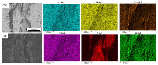 BSE and SE images and corresponding EDS elemental maps of the A1 alloy wear track after RT sliding.