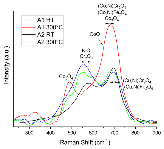 The Si3N4 counterfaces showed some abrasive wear with extruded wear debris at RT, while at 300 °C, the counterfaces exhibited similar features, along with some adhered metal oxide transfer films from the wear tracks. A similar study revealed there is no accumulation of third bodies or transfer films adhered to the Si3N4 balls after RT sliding for HEAs Al0.1CoCrFeNi and CoCrFeMnNi [30]. In order to better determine the tribochemcial oxide phases, Raman spectroscopy was performed inside the four wear tracks shown in Figure 4, Figure 5, Figure 6 and Figure 7. Figure 8 shows representative Raman spectra for the alloys after RT and 300 °C sliding. It is evident there are several oxide phases, both binary oxides and multi-element solid solution oxides, present in both alloys, including CoO, Co3O4, Cr2O3, NiO, and multi-element Cr2O4 and Fe2O4 tribochemical phases. These metal oxides tribochemically form at intermediate and higher temperatures via tribo-sintering the compact oxide tribofilm, which has been shown to lower the friction coefficients [28,33]. These oxide phases are in good agreement with the Raman spectra acquired inside FeCrNi medium-entropy alloy and CoCrFeNi HEA wear tracks, respectively [33,34]. The higher-Ni content A2 alloy at 300 °C exhibited a higher intensity peak of NiO and Cr2O3 in the tribofilm, which could be responsible for its lower friction and wear. Future studies will explore sliding temperatures higher than 300 °C to determine if there are more protective high-temperature oxide phases in both alloy tribofilms that result in low interfacial shear strength for friction reduction, while simultaneously providing low wear. It is possible that at higher sliding temperatures than 300 °C, the thermal softening process is counteracted by the formation of more protective tribochemical oxide phases that act as solid lubricants, thereby lowering friction and wear.