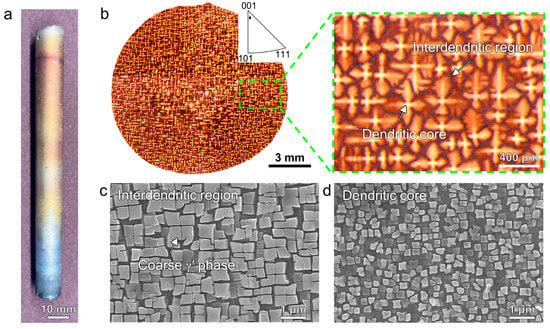 Photograph and cross-sectional microstructures of an as-grown Ni-based SX rod (3Ta6Al1Ti). (a) An SX rod; (b) Optical micrograph and inverse pole figure (inset) of the cross-section of the SX alloy, indicating that growth direction is along the [001] direction. SE images show that the γ′ phase in the interdendritic region (c) is larger than that in the dendritic core (d).