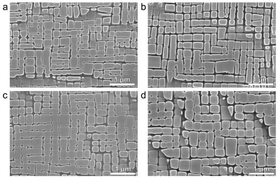 SEM images of Ni-based SX superalloys after solution and aging treatments: (a) 3Ta6.4Al1Ti; (b) 0Ta6.4Al2Ti; (c) 3Ta6Al1Ti; (d) 0Ta6Al2Ti. Four SX superalloys all have typical γ/γ′ two-phase microstructure.