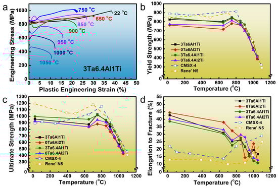 Tensile properties of Ni-based SX superalloys at a temperature range from RT to 1050 °C. (a) Stress-strain curves of Ni-based SX superalloy (3Ta6.4Al1Ti). (b) YS, (c) UTS, and (d) EF of four experimental alloys. For comparison, YS, UTS, and EF of two second-generation commercial alloys, CMSX-4 [] and Rene′ N5 [], are also included in (b–d).