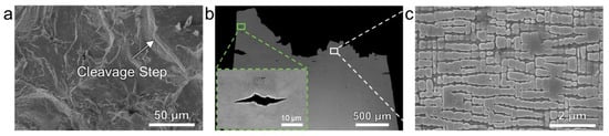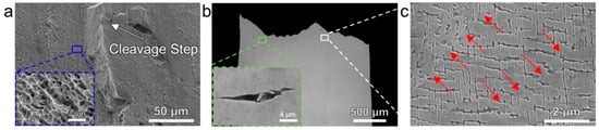 As the testing temperature increases to 1050 °C, the fracture surface and deformation mechanism of the samples are changed. The fracture surface is dominated by cleavage steps and without dimples (Figure 7a), which is consistent with the relatively low EF of ~10% (shown in Figure 4d). Moreover, no shear traces in both phases have been observed at 1050 °C (Figure 7c), indicating that deformation might be diffusion dominated rather than dislocation slip []. The γ′ phase appears to be stretched along the tensile direction of [001] and starts to connect in the horizontal direction indicating that γ phase has been squeezed due to Poisson’s effect. In addition, similar to the sample fractured at 850 °C, the weak region is still the interdendritic region, where microvoids are observed (Figure 7b).