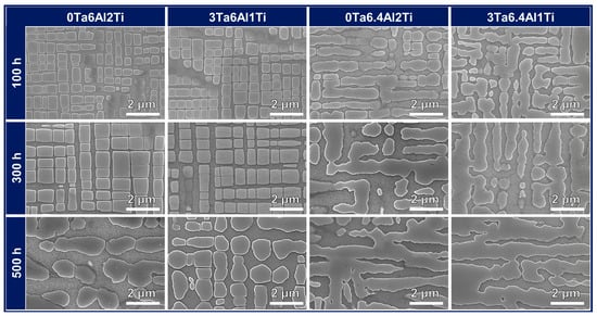 The microstructures of the four SX superalloys after thermal exposure at 1050 °C for up to 500 h are shown in Figure 8. No TCP phase formation is observed in all four alloys, indicating excellent phase stability. The γ′ morphology evolution during thermal exposure of those SX superalloys shows that the coarsening behavior depends on the composition. During 500 h thermal exposure, the γ′ phase of alloys with 6 wt.% Al (3Ta6Al1Ti and 0Ta6Al2Ti) coarsens slower than that with 6.4 wt.% Al. Moreover, γ′ particles in the alloys with 6 wt.% Al become irregular, but they are still separated by the γ phase after 500 h exposure at 1050 °C. In comparison, γ′ particles in alloys with 6.4 wt.% Al start connection to form rafting microstructure after 100 h thermal exposure, which continuously coarsens as thermal exposure time increases. It is clear that decreasing Al concentration appears to increase the resistance to rafting in the four alloys.