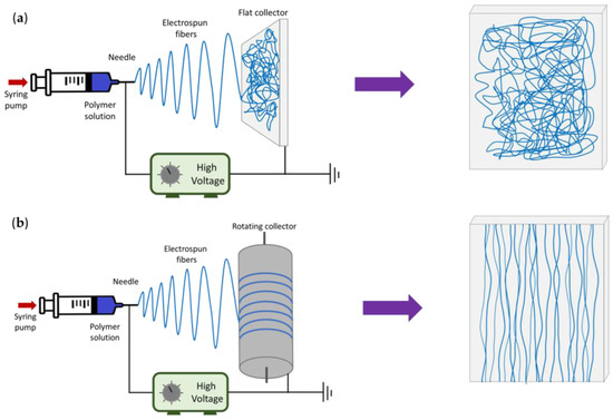 Schematic representation of the electrospinning setup and the final distribution of the fibers in each type of collector. (a) Flat collector and (b) rotating collector.