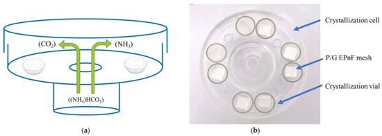 Schematic representation and photograph of the GD crystallization method. (a) Schematic of the crystallization cell with crystallization vials inside, and (b) photograph (top view) of the crystallization cell with vials containing P/G EPnF meshes.