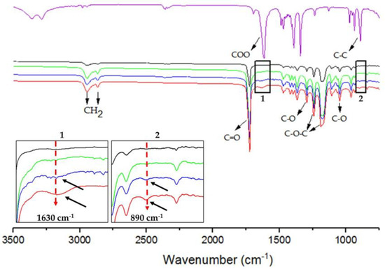 ATR/FT-IR spectra of (purple) G, (black) P/G0-EPnF, (green) P/G0.5-EPnF, (blue) P/G1-EPnF, and (red) P/G2-EPnF. Insets 1 and 2 show zoomed-in images of the absorption bands of G at 890 cm−1 and 1630 cm−1 for C-C and the carboxylic groups in the P/G- EPnF meshes.