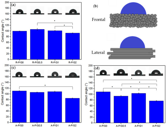 The static water CA. (a) R-P/G-EPnF, (b) schematic representing the different ways of measuring CA on an anisotropic surface, (c) A-P/G-EPnF obtained frontal to the fibers, and (d) A-P/G-EPnF obtained lateral to the fibers. Asterisk (*) indicates p < 0.05.