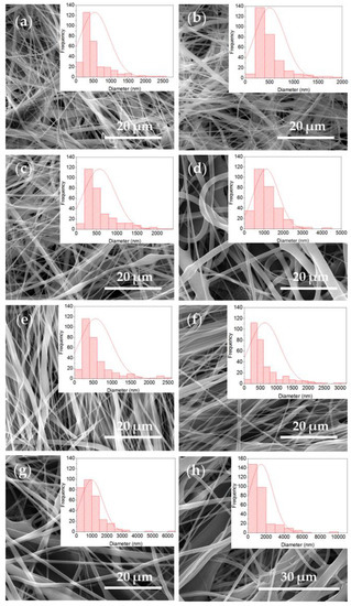 SEM images and histogram of fiber diameter distribution of the R-P/G-EPnF and A-P/G-EPnF meshes. (a) R-P/G0-EPnF, (b) R-P/G0.5-EPnF, (c) R-P/G1-EPnF, (d) R-P/G2-EPnF, (e) A-P/G0-EPnF, (f) A-P/G0.5-EPnF, (g) A-P/G1-EPnF, and (h) A-P/G2-EPnF.