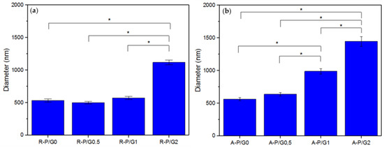 Average fiber diameter of the (a) R-P/G-EPnF meshes obtained with the flat collector and (b) A-P/G-EPnF meshes obtained with the rotary collector. Asterisk (*) indicates p < 0.05.