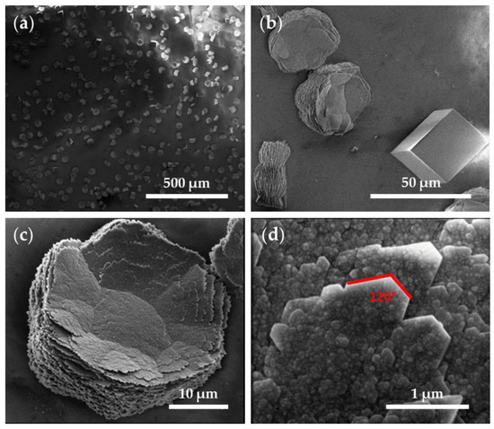 The SEM images of the CaCO3 crystals obtained through GD (Figure 7) showed a homogenous distribution of the crystalline material in the control tests using a glass substrate (Figure 7a). Further observed were rhombohedral structures, corresponding to smooth-surfaced calcite crystals (29.6 ± 8.1 µm), and flower-like hexagonal structures (38 ± 4.8 µm in diameter) formed by stacked flakes (≈70 nm in height) (Figure 7b–d), which correspond to the polymorph vaterite. The surface of the flower-like structures presented a nanogranular texture (38.5 ± 14 nm) (Figure 7d). The crystal boundary ended at 120° angles, indicating that these hexagonal plates correspond to the phase (001) monocrystals of vaterite and the hexagonal boundaries parallel to {110}, as described elsewhere [36]. Although the morphologies of the crystals are quite varied, characteristic morphologies were described for the CaCO3 polymorphs (namely, rhombohedral calcite, needle-like aragonite, and spherical vaterite) [5,36,37,38], and these allowed us to approximate the observed polymorphs using SEM, which were later confirmed using XRD (please see Table 2).