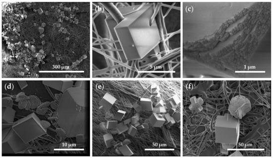 An analysis of the P/G-EPnF and P/G/CaCO3-EPnF meshes revealed that, independent of the fiber orientation and composition of the P/G-EPnF meshes, the crystals were not distributed homogeneously over the matrix. Instead, agglomerates of crystals in different zones were observed, and they decreased the surface energy of the crystals that were smaller due to the presence of a greater number of nucleation centers (Figure 8a) [37]. Furthermore, the CaCO3 crystals closely interacted with proximally growing fibers (Figure 8b). This occurred because there was a geometric match between the functional groups of the organic matrix and the crystal lattice of a specific phase [26,38]. Further found was that both the lattices and respective compositions influenced the process. This is explained by the fact that the environment where mineralization occurs determines the morphology and size of the crystals obtained [7,8]. However, the CaCO3 crystals had defects on the crystalline surface in the presence of meshes (Figure 8c), as opposed to what occurred in the absence of meshes (Figure 7).