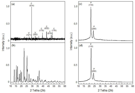 XRD diffractograms. (a) CaCO3, (b) glycine betaine, (c) R-P/G0-EPnF, and (d) R-P/G2-EPnF. The abbreviations of C, V, and P correspond to calcite, vaterite, and poly (ε-caprolactone), respectively.