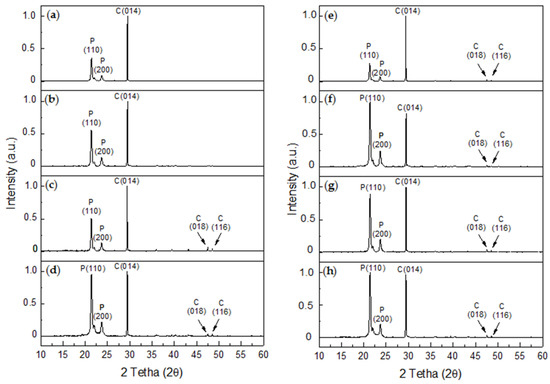 XRD diffractograms of CaCO3 obtained for GD assays on R-P/G-EPnF and A-P/G-EPnF meshes. (a) R-P/G0-EPnF, (b) R-P/G0.5-EPnF, (c) R-P/G1-EPnF, (d) R-P/G2-EPnF, (e) A-P/G0-EPnF, (f) A-P/G0.5-EPnF, (g) A-P/G1-EPnF, and (h) A-P/G2-EPnF. The abbreviations of P, C, and V correspond to polycaprolactone, calcite, and vaterite, respectively.