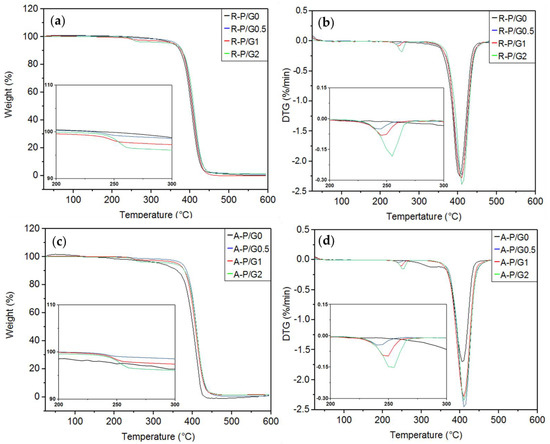 TGA and DTG curves for the R-P/G-EPnF and A-P/G-EPnF meshes. (a) TGA of R-P/G-EPnF, (b) DTG of the R-P/G-EPnF meshes, (c) TGA of the A-P/G-EPnF meshes, and (d) DTG of A-P/G-EPnF.