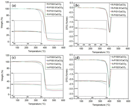 TGA and DTG curves for the R-P/G/CaCO3-EPnF and A-P/G/CaCO3-EPnF hybrid meshes. (a) TGA of R-P/G/CaCO3-EPnF, (b) DTG of R-P/G/CaCO3-EPnF meshes, (c) TGA of A-P/G/CaCO3-EPnF meshes, and (d) DTG of A-P/G/CaCO3-EPnF meshes.