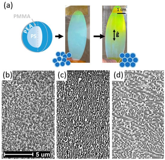 The POs are then ordered by Bending-Induced Oscillatory Shear (BIOS), first proposed by Zhao et al. []. The films, of approximately 100–150 µm thickness, are drawn over 1 cm diameter rollers, heated to 100 °C at a shear rate of 1 cm s−1, with the shear direction ĝ indicated. This is repeated 0–40 times in order to obtain improved sample ordering, which is optimal at 40 BIOS iterations (see illustrated inset). The cross-linked PS cores remain rigid as they are forced by the compression to flow through the soft poly(ethyl acrylate) matrix. The end result is rubbery, free-standing films displaying intense structural color which changes with viewing angle and illumination, pictured rightmost in Figure 1a. With the resulting peak wavelength of color appearance dependent on the CIS particle diameter, this process has previously been tuned to engineer POs reflecting in the UV [] through to red [] and near-infrared part of the spectrum.