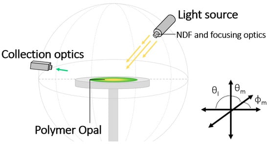 The three-dimensional reflectance goniometer instrumentation, with co-ordinate nomenclature inset. The polymer opal is situated in the center of the dark box environment, while the position of light source and collection optics with neutral density filter (NDF) are remotely controlled, allowing the relative reflectance to be measured under a range of viewing conditions. θI defines the incident angle, ϕm the viewing plane, and θm the viewing angle within the plane.