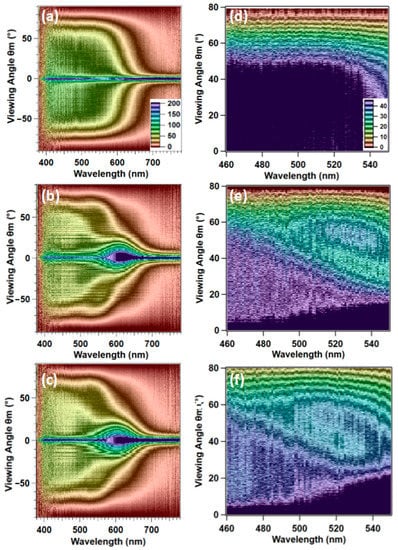 Hemispherical scans of relative reflectance are shown in Figure 3 for polymer opals of 0, 20, and 40 BIOS passes, showing the change in structural color properties as a function of increasing structural order and ordering depth []. These represent the stacked spectra collected at every viewing angle between ±90°, where the opal is illuminated from the zenith. The scattering features of interest are shown enlarged for each opal, with these rescaled for clarity in Figure 3d–f. Relative reflectance can be seen to exceed 100% due to measurements having been taken with reference to a Lambertian scatterer which scatters omnidirectionally as discussed, compared to polymer opals which by their nature as photonic crystals display preferential scattering directionality. The most intense specular scattering around the 0° viewing direction has been removed, in addition to detector obscuration.