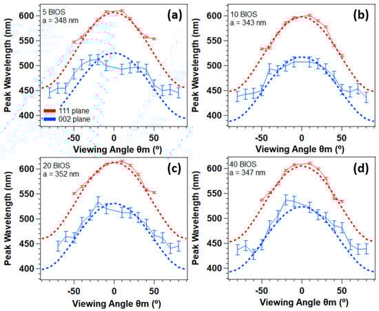 with the only allowed combination of h, k, and l for the face-centered cubic lattice case being given by the {002} plane group. In the same manner, peak wavelengths were extracted prior with the fitting of Voigt functions; this is carried out for viewing angle values from −80° to 80° in 10° increments, where possible. This fits to values expected in accordance with the Bragg–Snell law, as shown by Figure 4. The central specular feature given by the {111} plane is denoted in red, with the {002} plane group feature shown in blue, and the dashed lines corresponding to the Bragg-Snell law behavior. Error is seen to be somewhat greater for the {002} feature due to the difficulty in accurate peak wavelength extraction where intensity is markedly lower. Nevertheless, these calculated values of h, k, and l show a good fit to the Bragg-Snell law and this data conclusively evidences the Bragg scattering origins of this high-angle structural color. Although the level of fit is seen to depreciate past approximately 50°, the fit remains acceptable up to around 70° for 20 and 40 BIOS. Our previous work [] has highlighted that good structural ordering is seen to reach the Bragg penetration depth of around 10 µm for approximately 10 BIOS, and this is the primary suggestion as to why the fit with Bragg-Snell is particularly poor for 5 BIOS. This is most pertinently the case around the specular direction, illustrated by a dip in the peak wavelengths (Figure 4a). Here, the measured light penetrates deepest into the sample before reflection, so this corresponds with the viewing direction where the measured scattering is most sensitive to the crystalline disorder that persists in the film at this stage in processing. This is, furthermore, evidenced by that seen for 10 BIOS, where around the specular viewing direction the fit to Bragg-Snell is markedly improved in line with reasoning that ordering has now permeated down to the Bragg penetration depth. This figure additionally elucidates other structural changes that occur as BIOS advances—for example, the Bragg-Snell fit for the {002} plane is shown to reach an optimal point at 10 BIOS. Asymmetry in peak wavelength is clearly evident for 20 BIOS at viewing angles of ±20°, and this area of the fit continues to depreciate for 40 BIOS over the range ±10–30°. This is likely caused by the innate disordering mechanisms of shear [] beginning to affect the outer layers of the crystal, because one can also observe how the {111} fit drifts from the expected behavior, albeit slightly. Indeed, this suggestion is also evidenced by the discrepancies in the calculated values of the lattice parameter indicate deformation competing with self-assembly. Further work is necessary in optimizing the ordering depth obtained from BIOS in line with desired application, and mapping this in further detail to other structural color metrics such as reflectance intensity and color purity, in addition to quantification of the color appearance.