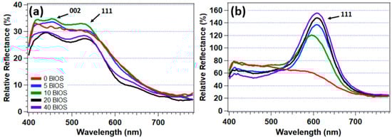Spectroscopic data of relative reflectance for polymer opals of 0–40 BIOS passes from the viewing angles (a) θm = 70° and (b) θm = −10°, with the peaks originating from the {002} and {111} planes indicated.