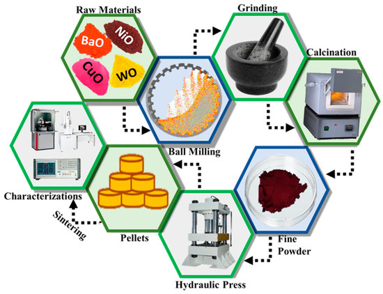 The solid-state reaction approach is versatile in chemical synthesis processes, particularly when the reaction involves oxides as precursors. It is usually assisted by an intermediate and repeated ball milling process. This approach gives high yield, a uniform particle size distribution, fewer impurities and high selectivity of the product. It has been extensively employed for the synthesis of variety of nanomaterials, including spinels, perovskites, and double perovskites. In the present study, this technique was used for the synthesis of Cu-substituted Ba2NiWO6. In this process, BaO (Reagentplus, 99.99%, Saint Louis, MO, USA), NiO (Nanochemazone, 99.99%, Saint Louis, MO, USA), CuO (Sigma Aldrich, 99.99%, Saint Louis, MO, USA), and WO (Sigma Aldrich, 99.99%, Saint Louis, MO, USA) were used as precursors. These precursors were measured according to stoichiometric ratios and mixed by the planetary ball-milling technique at a speed of 500 rev/min to form a homogenous mixture [13]. After that, these materials were ground followed by calcination at 1000 °C for 2 h to obtain the single phase BaNiWO6 and BaNi0.5Cu0.5WO6. Alsabah et al. synthesized A2YVO6 (A = Mg, Sr) double perovskites using solid-state route and investigated their optical behavior through UV-Vis spectroscopy [14]. Similarly, Bharti et al. fabricated Sr2CeSbO6 double perovskites using the same approach and explored the dielectric behavior. Based on the observed value of activation energy, they suggested that this type of behavior is associated with the hopping mechanism of electrons [15]. In addition, Chen et al. in their study, covered most of the chemical approaches which could be employed to synthesize oxides-based double perovskites and highlighted various aspects regarding their applications [16]. These calcined samples were again ground to obtain a fine powder and ultimately transformed to pellet form with a 10 mm diameter and 1.1 mm thickness for different characterizations [17]. Before characterizations, the samples were sintered at 400 °C for 2 h. The schematic of the solid-state reaction method is shown in Figure 1.