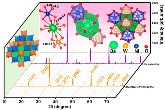 The X-ray diffractograms of the prepared samples of Ba2NiWO6 and Ba2Ni0.5Cu0.5WO6 were used to confirm the development of their cubic double perovskite phases. Figure 2 illustrates the XRD patterns of Ba2NiWO6 and Ba2Ni0.5Cu0.5WO6. It was found that peaks in the XRD pattern of Ba2NiWO6 emerged at 18.93°, 31.16°, 36.71°, 38.40°, 44.64°, 48.90°, 55.44°, 59.13°, 64.98°, 68.35° and 73.82° 2θ values, and these peaks were in good agreement with ICSD card no. 01-073-0135, indicating the formation of a cubic double perovskite phase with space group Fmm [18]. The value of lattice constant (a) calculated from the position of the peaks was determined to be 8.0850 Å. A small shift in the (220) peak towards a smaller 2θ with the incorporation of Cu2+ in the place of Ni2+ is attributed to the larger ionic radius of Cu2+ (0.73Å) as compared with Ni2+ (0.69Å) [19]. This shifting of peaks towards smaller 2θ values reflects the expansion of the unit cell and the value of the lattice parameter for Ba2Ni0.5Cu0.5WO6 to 8.1137 Å [20,21]. The crystallite size (D) was computed using Scherrer’s expression: