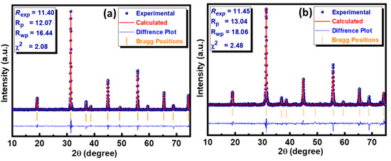 where k is 0.9, which is the shape factor, λ represents the wavelength of CuKα, β signifies the full width at half maximum (FWHM), and θB is the Bragg diffraction angle [22]. The reliability of the crystal structure data was further reinforced by performing the Rietveld refinement using HighScore Plus software. This technique provides a platform to compare the experimental data of the series under investigation with reference data available in the database. This comparison generates a difference plot between experimental and standard data based on the difference in peak position, peak shape, and peak height. This difference is quantified in terms of various residual factors, including the profile factor (Rp), weighted profile factor (Rwp), and expected profile factor (Rexp), to determine the most important factor, the so-called goodness of fit (GoF). The small value of χ2 (<10) indicates the goodness of fit to structural data. The Rietveld refined graphs of both compositions along with their residual factors are presented in Figure 3a,b.