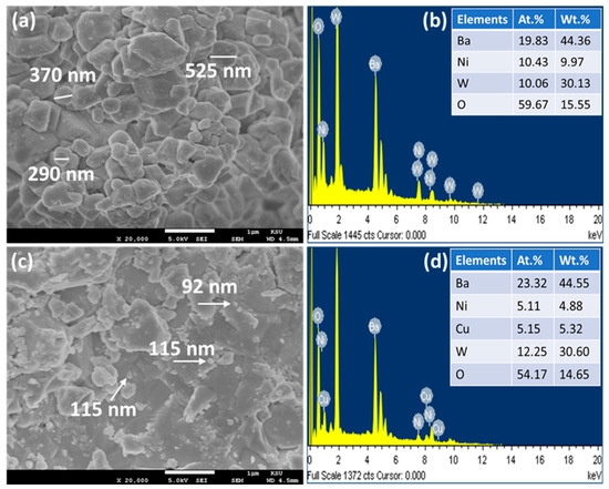 EDX spectroscopy is a powerful approach and when used in conjunction with SEM, is capable of distinguishing the presence of different elements in any composition by detecting the X-rays emitted from those elements. In addition to the detection of elements, it also helps to quantify these elements. The EDX spectra of Ba2NiWO6 and Ba2Ni0.5Cu0.5WO6 are presented in Figure 4b,d. The presence of Ba, W, Ni, and O in the EDX spectrum of pure Ba2NiWO6 and the presence of Cu in addition to all other elements in the spectrum of Ba2Ni0.5Cu0.5WO6 indicate impurity-free compositions within the detection limit of EDX. The atomic and weight percentage of all involved elements are also incorporated in the EDX spectra and are in good agreement with their stoichiometric formula, thus confirming the formation of the exactly targeted compositions [26].