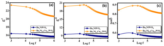 Figure 5c shows how the loss tangent (tan δ) for Ba2NiWO6 and Ba2Ni0.5Cu0.5WO6 samples responds to the applied field with varying frequency. It was calculated using the relation tan δ = 1/2πfRpCp, where 2πf represents the angular frequency (ω), Rp stands for the parallel resistance, and Cp denotes the parallel capacitance. The polarization lags the electric field because of impurities, defects, and grain boundaries, which are linked to the loss tangent. The highest amount of electrical energy is transferred to ions when the vibrational frequency of charge carriers matches the frequency of the electric field; as a result, we can see a power loss peak in Figure 5c. The relation for higher loss in the sample is ωτ = 1, where τ represents relaxation time, which is related to τ = 1/2p as p is the jumping probability per unit time, so ωτ = 1 can also express as ωmax = 2p [29]. It was observed that Ba2NiWO6 and Ba2Ni0.5Cu0.5WO6 exhibited a rapid decrease at frequency 104 Hz, which indicates that at this frequency, the space charge polarization was no longer actively responding to the applied field [30,31].