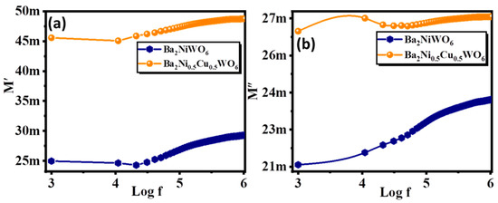 Variation in (a) real part, and (b) imaginary part of modulus with frequency for Ba2NiWO6 and Ba2Ni0.5Cu0.5WO6.