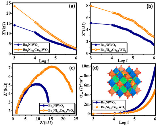Complex impedance analysis is an interesting and exciting approach to investigating a material’s electrical response to the applied a.c. field in the given frequency range. The measurement of impedance is similar to sensing the material’s accumulative resistive and capacitive response originating from the different intergrain and intragrain nature. The reorientation of dipoles, charge transport, and generation of space charges all are influenced by the frequency of the applied field [34]. The variation of real (Z′) and imaginary (Z″) parts of impedance are presented in Figure 7a,b. The high value of Z′ at low frequency is associated with the accumulation of space charges at the grain boundaries giving rise to the large value of space charge polarization. The value of Z′ decreased with the increase in frequency, which is due to the enhanced conductivity of the materials. The value of Z′ is larger for Ba2Ni0.5Cu0.5WO6 compared with Ba2NiWO6, and this difference is more pronounced in the lower frequency region. This larger value of Z′ for Ba2Ni0.5Cu0.5WO6 is consistent with its morphology. The smaller-sized grains provide more intergrain area and thus provide more resistance to the charge flow. The imaginary part of the impedance is the capacitive reactance of the material, which has an inverse relationship with the frequency of the applied field; therefore, the value of Z″ decreases with an increase in frequency, as shown in Figure 7b.
