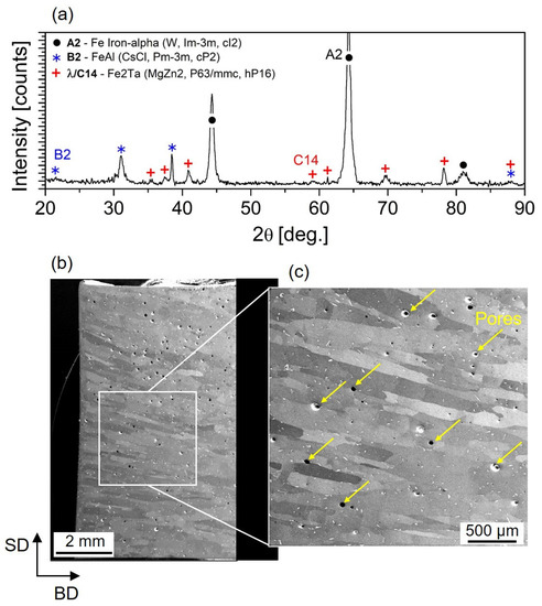 Figure 1b presents typical BSE-SEM micrographs of LPBF-manufactured cylindrical specimens for compression tests. The microstructure consists primarily of columnar grains elongated along the BD. A few pores are also visible, as marked by arrows in the high-resolution image in Figure 1c. A comparable grain morphology was reported for Fe3Al parts fabricated by AM [39]. The high magnification image in Figure 1c shows that the Fe-Al matrix grains are decorated with a white contrast phase. According to previous studies [9,40] and the XRD results from Figure 1a, this phase corresponds to the C14 Laves phase (Fe, Al)2Ta with hexagonal crystal symmetry. The low solubility of Ta in the binary Fe-Al phases leads to the precipitation of the ternary Laves phase when small amounts of Ta are added to Fe(Al) solid solution phases [41]. The C14 precipitate particles are relatively homogeneously distributed throughout the microstructure, both at the Fe-Al grain boundaries (GBs) and within the grains.