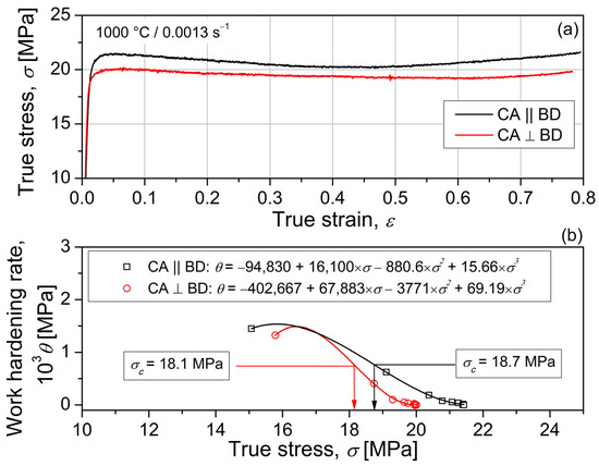 True stress–strain curves (a) and strain-hardening rate (θ) versus flow stress (σ) up to the peak stress (b) of LPBF specimens hot compressed at 1000 °C up to a true strain of 0.8 with a strain rate of 0.0013 s−1 in different directions to the BD. The rise in flow stress after a steady state is due to the dominance of friction and bulging of the specimens at higher strains. The θ−σ curves were fitted by a third-order polynomial, and the relationships between θ and σ were given. The CA and BD refer to the compression axis and building direction in the LPBF process.