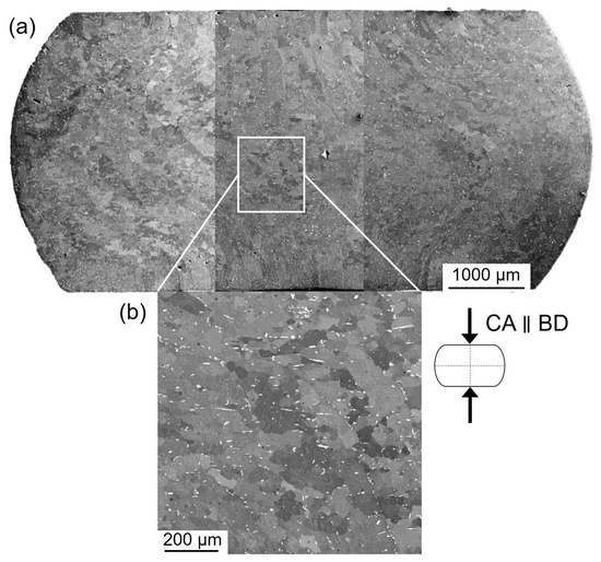 Figure 3a presents typical BSE-SEM micrographs of the LPBF-manufactured samples deformed at 1000 °C/0.0013 s−1 up to a true strain of 0.8, where the compression axis (CA) was parallel to the BD. The material is subjected to a slight deformation in the areas close to the forging dies (known as the dead metal zone). In contrast, deformation is localized mainly in the central region of the specimens, characterized by heavily deformed grains as shown in a high-resolution image in Figure 3b. No cracks were observed in the deformed specimens, while a few pores are still visible after deformation, mainly near to the low-deformation and bulged zones. The central region of the deformed specimens, where the material is subject to high deformation under compressive stress, is almost free of pores.